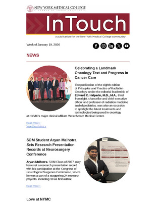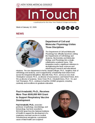 InTouch is New York Medical College's e-newsletter distributed to all students, faculty and staff, published during the academic year by the Office of Public Relations. Suggestions for story ideas are always welcome. Please email your comments and inquiries to Public Information Editor Lori-Ann Perrault at lori_perrault@nymc.edu.